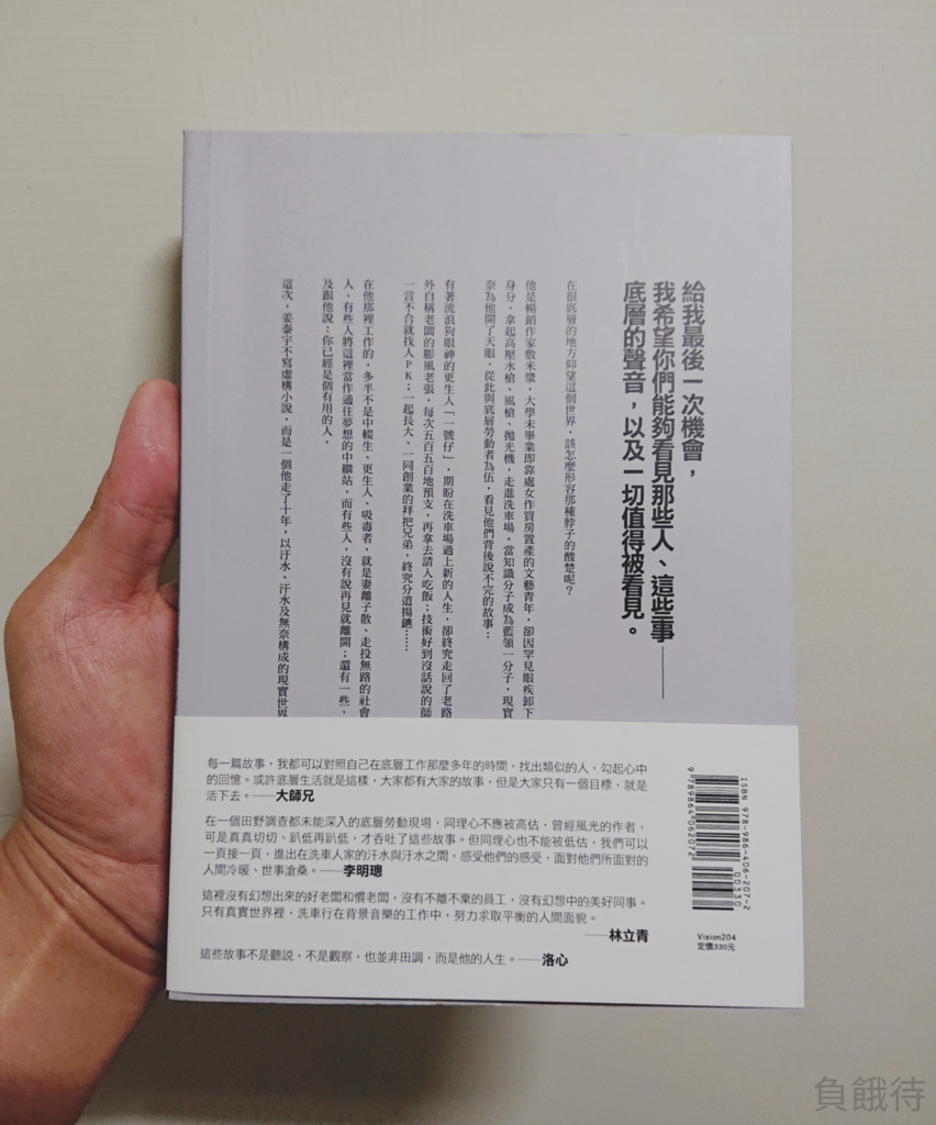 我常常在想自己能成為怎樣的人,但是都跟自己的想像很有落差,讀姜泰宇(或是敷米漿)的洗車人家,更是讓我有如此的感覺,不是覺得自己不好或是想埋怨什麼,而是很多事情不是光靠努力就有用,在社會底層的人或是活得光鮮亮麗的人,如何能互相體諒?對於現在社會的差異,已經不只是用貧富來判定了,還有地位、可能小到連你拿的手機或是穿的鞋子都能比較,更遑論那些世俗價值。